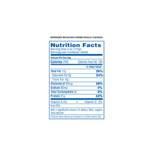 Springer Mountain Farms Whole Chickens are hand selected at the optimum size for baking so they come out tender and juicy every time. Each one is individually wrapped and sealed, and contains a giblet pack.